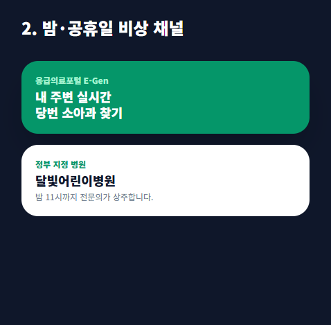 - 달빛어린이병원 검색: 밤 9시가 넘었거나 휴일이라면 일반 의원보다는 정부가 지정한 '달빛어린이병원'을 찾는 것이 빠릅니다. 응급실보다 대기 시간이 짧고 소아과 전문의에게 직접 진료받을 수 있어 비용과 시간 모두 절약됩니다.