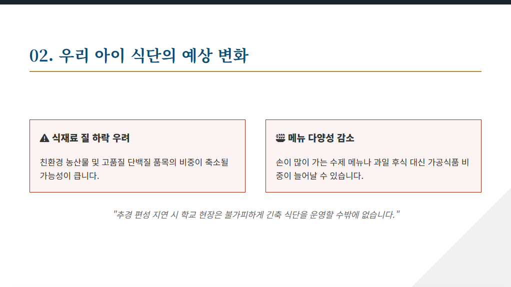 - 메뉴 다양성 감소: 과일·수제 메뉴 등 손 많이 가는 품목 축소, 가공식품 비중 확대 우려.