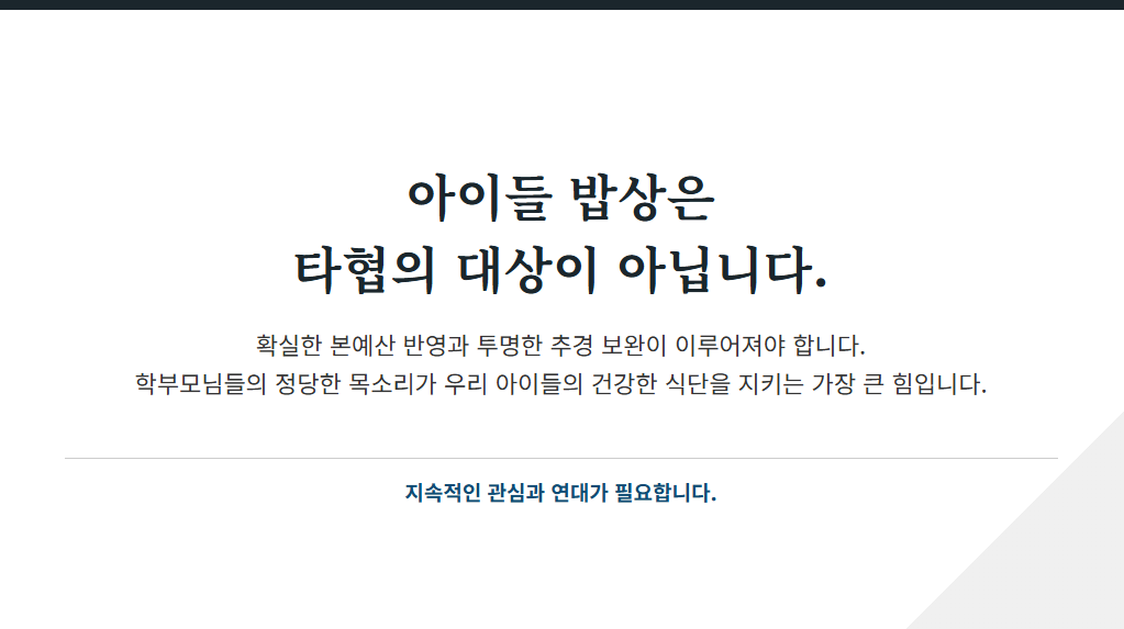 아이들 밥상은 타협의 대상이 아닙니다. 확실한 본예산 반영 + 추경 보완이 동시에 이뤄져야 현장의 불안을 줄일 수 있습니다. 학부모 공동의 목소리가 의회 증액 논의에 가장 큰 압력입니다.