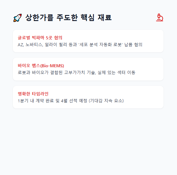 • 바이오 멤스(Bio-MEMS) 기술력: '로봇'과 '바이오'가 결합된 고부가가치 기술로, 시장의 수급이 반도체에서 실체 있는 바이오 섹터로 이동하는 시점과 맞물려 파급력이 커졌습니다.