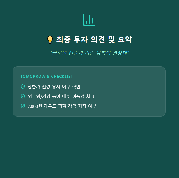 • 내일 체크리스트: 상한가 잔량의 유지 여부와 외국인/기관의 동반 매수 연속성을 확인하십시오.