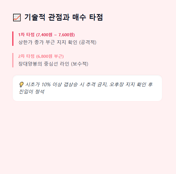 1. 1차 타점 (공격적): 7,400원 ~ 7,600원 사이. 내일 장중 위꼬리를 달거나 일시적인 눌림이 발생할 때 상한가 종가 부근에서 지지 여부를 확인해야 합니다.