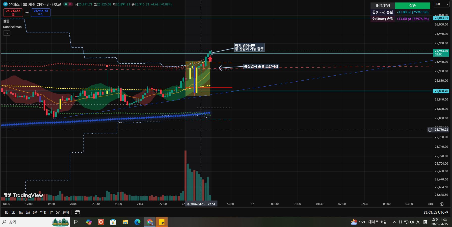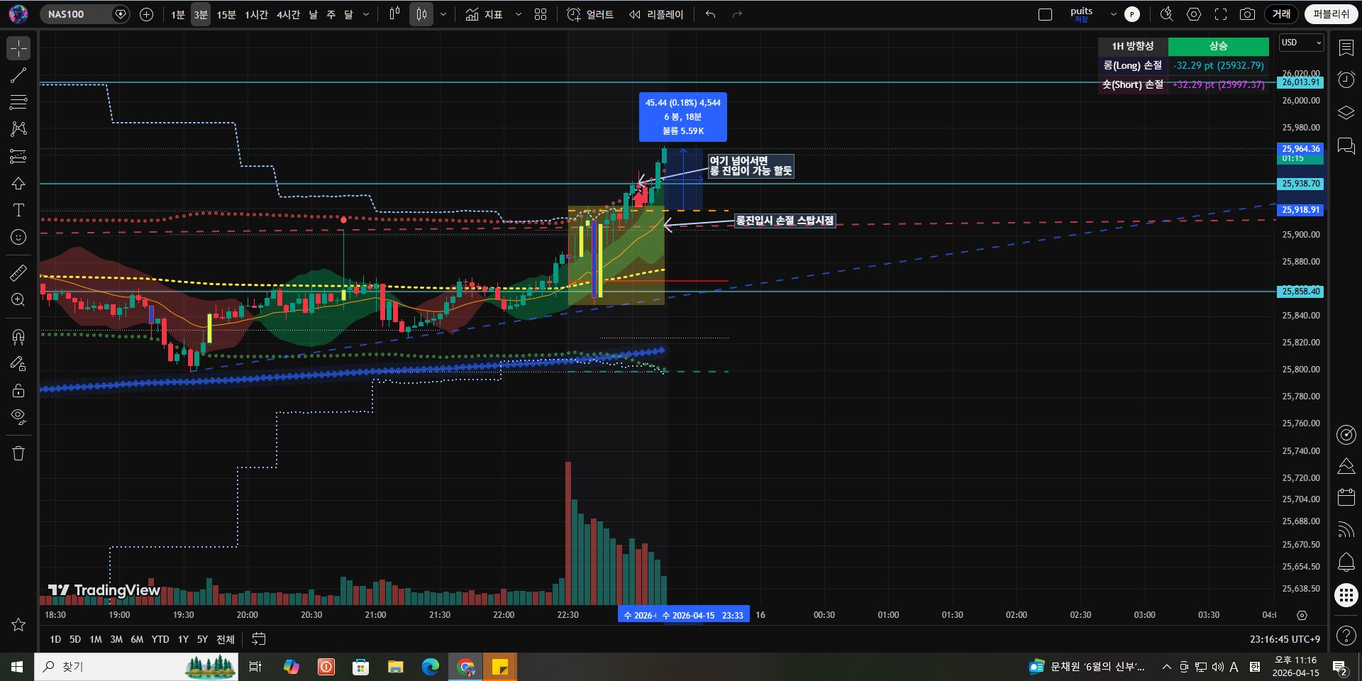 사실 어제(15일) 계좌 승인을 기다리며 중간중간 차트에 매매 예상을 표기해 보았는데요. 나스닥이 분석한 대로 너무나도 정직하게 상승해 주는 바람에, 오히려 '어제 진입했다면 대박이었을 텐데' 하는 아쉬움도 남습니다. 하지만 우리에게는 실시간으로 그려지는 기계적 차트가 있고, 매주 5일 내내 새로운 기회가 찾아오니 조급해할 필요는 전혀 없습니다.