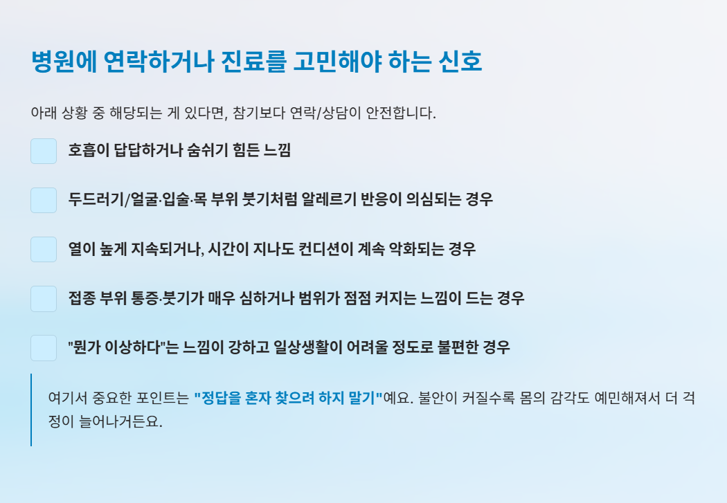 - 불안하면 “병원 문의 문장”을 미리 메모해두기(혼자 검색하지 않도록)