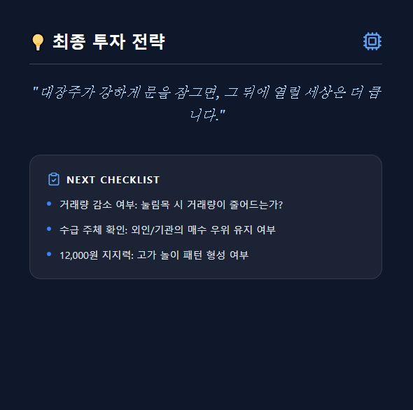 - [ ] 12,000원 지지력: 오늘 상한가 부근을 지켜내며 '고가 놀이' 패턴을 만드는가?