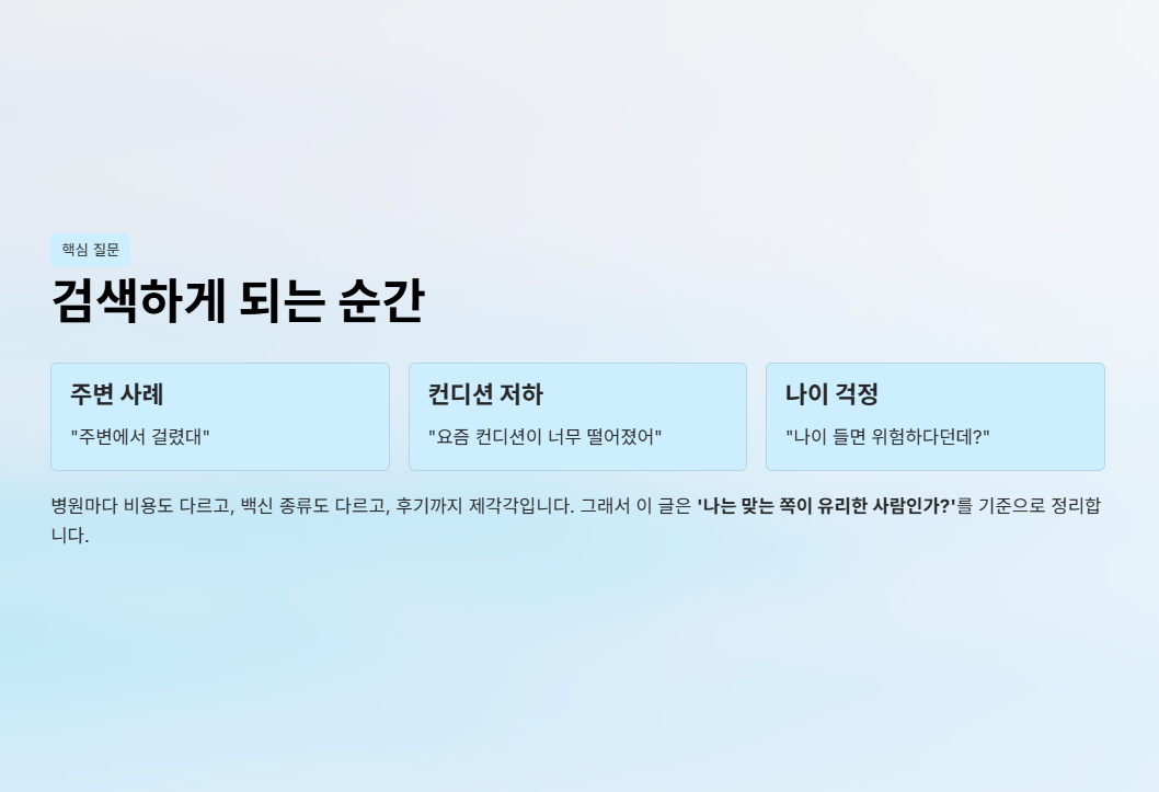 여러분이 대상포진 예방접종을 고민하게 된 이유는 “나이”, “주변 사례”, “컨디션 저하”, “막연한 불안” 중 어디에 가장 가까우신가요?