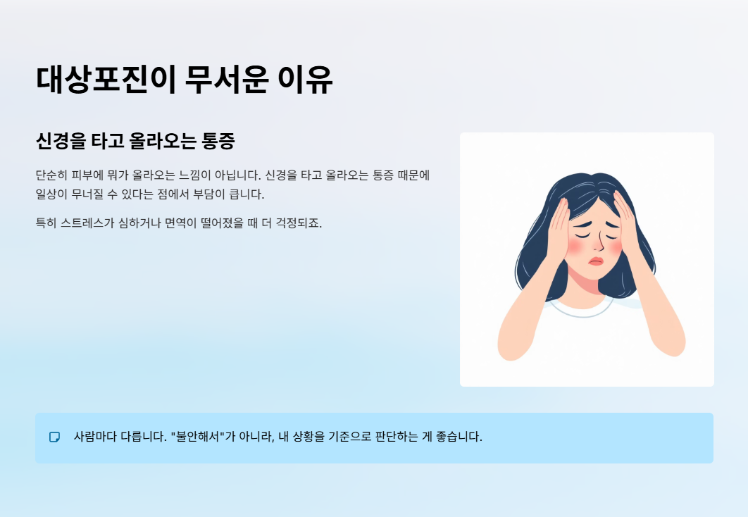 대상포진은 단순히 피부에 뭐가 올라오는 느낌이 아니라, 신경을 타고 올라오는 통증 때문에 일상이 무너질 수 있다는 점에서 부담이 큽니다. 특히 스트레스가 심하거나 면역이 떨어졌을 때 더 걱정되죠.
