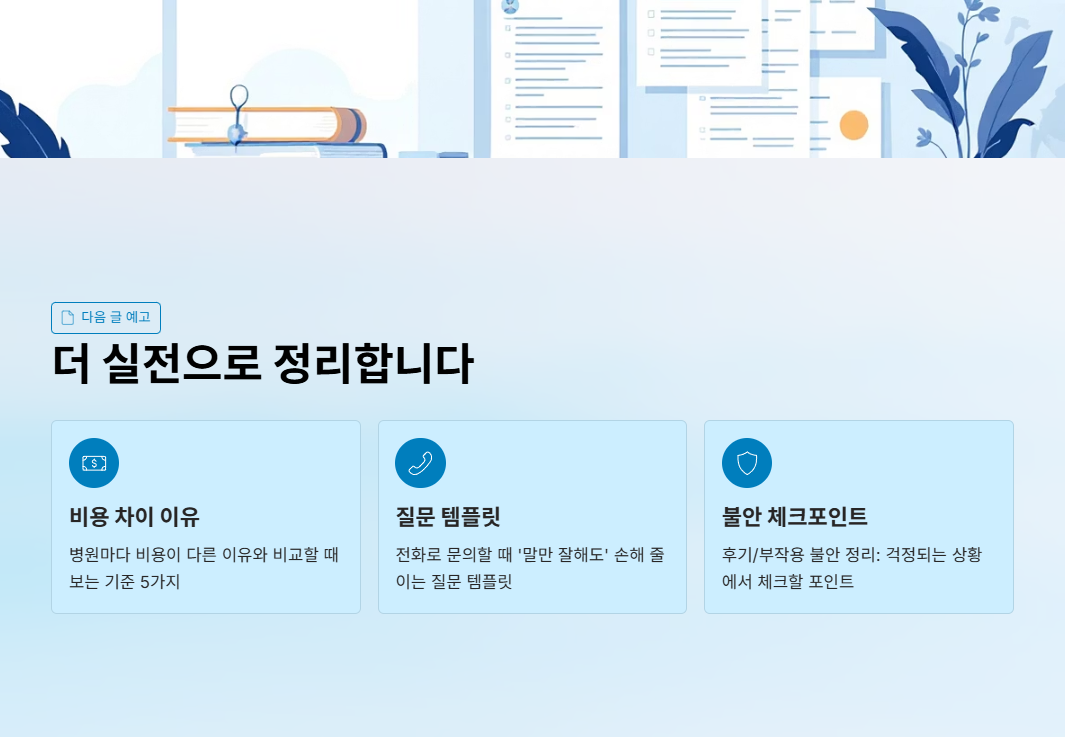 병원에 문의할 때는 아래 3가지만 확인해도 시행착오가 확 줄어듭니다.