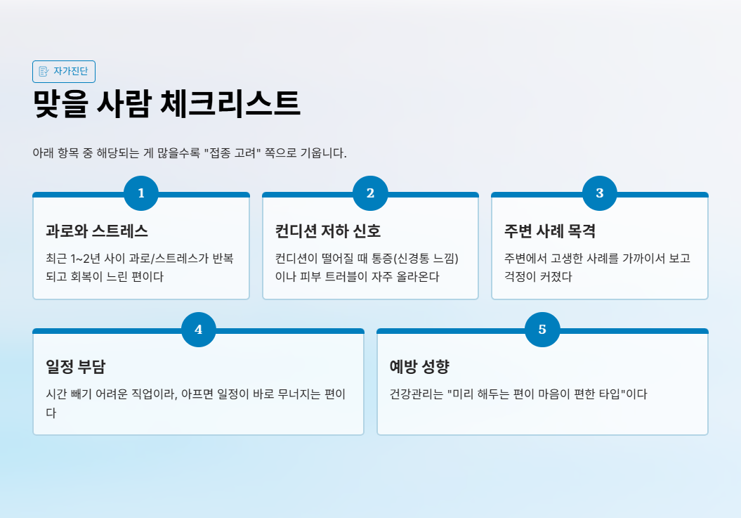 아래 항목 중 해당되는 게 많을수록 “접종 고려” 쪽으로 기웁니다.