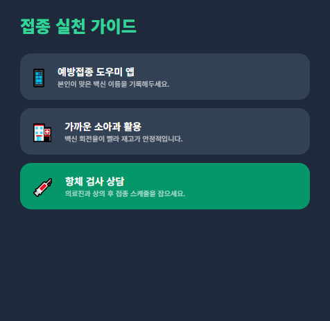 - 가까운 소아과 활용: 소아과는 백신 회전율이 빨라 재고가 안정적이고, 성인 접종도 함께 취급하는 곳이 많습니다. 아이와 함께 방문하여 온 가족이 스케줄을 맞추는 것도 좋은 방법입니다.