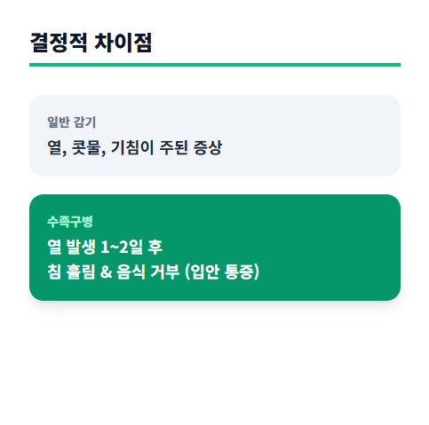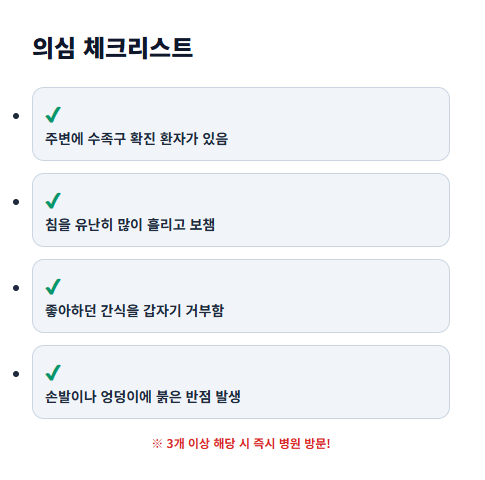 메타설명: 수족구병 초기 증상과 감기 구별법을 상세히 알아봅니다. 입안 통증, 손발 발진 체크리스트부터 식사 요령, 전염 기간 및 등원 중지 기준까지 부모님이 꼭 알아야 할 핵심 정보를 정리했습니다.