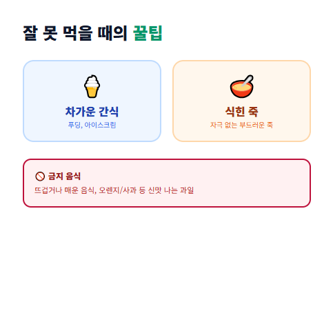 - 부드럽고 차가운 음식: 뜨겁거나 매운 음식, 산도가 높은 과일(오렌지, 사과 등)은 궤양 부위를 자극합니다. 차가운 우유, 식은 죽, 요거트, 아이스크림 등이 통증 완화와 수분 보충에 도움이 됩니다.