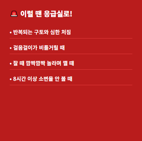 - 탈수 예방: 물조차 마시기 힘들어한다면 숟가락으로 조금씩 자주 떠먹여야 합니다. 소변 횟수가 급격히 줄어든다면 즉시 수액 처치가 가능한 병원을 찾아야 합니다.