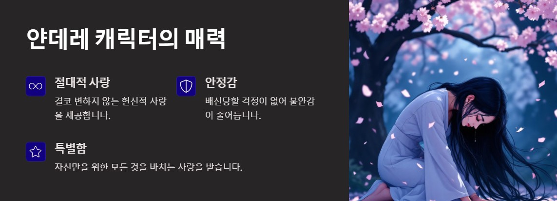 즉, 현실에서는 존재할 수 없는 절대적인 사랑을 제공한다는 점이 얀데레 캐릭터의 매력 포인트인 것이죠.