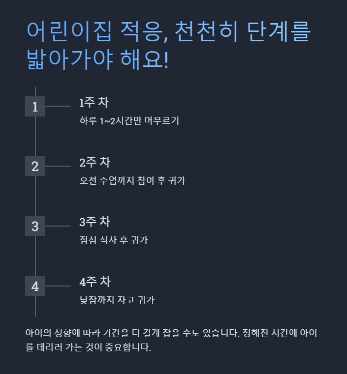 아이의 성향에 따라 기간을 더 길게 잡을 수도 있습니다. 아이가 처음부터 장시간 어린이집에 머물게 되면 분리 불안이 커질 수 있으므로, 점진적으로 시간을 늘려가는 것이 좋습니다.