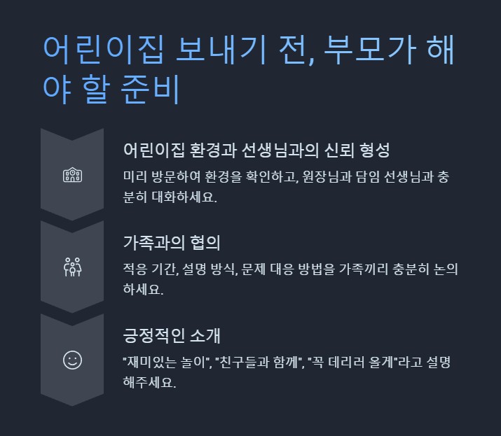 어린이집을 결정한 후에는 미리 방문하여 환경을 확인하고, 원장님과 담임 선생님과 충분히 대화하는 것이 중요합니다. 부모가 신뢰를 가지면 아이도 안정감을 느낄 수 있습니다.