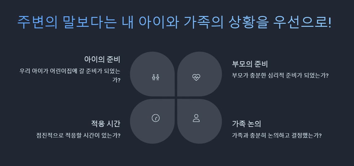 많은 부모가 "너무 일찍 보내는 것 아니냐?" 또는 "이제야 보내면 늦는 것 아니냐?"라는 주변의 시선에 고민합니다. 하지만 남들의 기준이 아닌, 우리 가족과 아이의 상황을 고려하는 것이 가장 중요합니다.