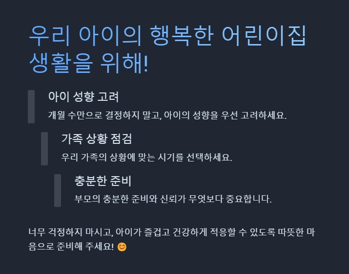 어린이집 입소 시기는 정해진 정답이 있는 것이 아닙니다. 개월 수만으로 결정하는 것이 아니라, 아이의 성향과 가족의 상황을 고려하는 것이 중요합니다. 또한, 부모가 아이를 보내는 것에 대한 충분한 준비와 신뢰를 가지는 것이 무엇보다도 중요합니다.