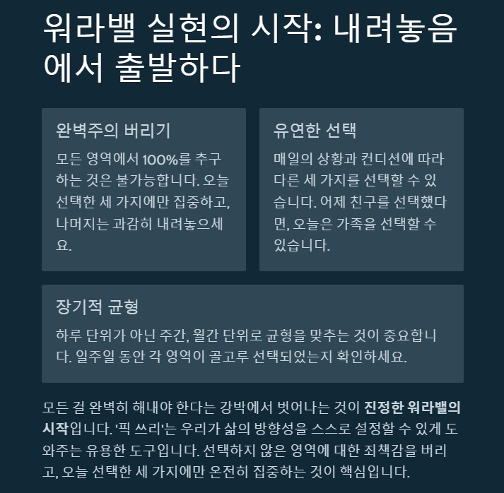 모든 걸 완벽히 해내야 한다는 강박에서 벗어나는 것이 진정한 워라밸의 시작입니다. ‘픽 쓰리’는 우리가 삶의 방향성을 스스로 설정할 수 있게 도와주는 유용한 도구입니다.