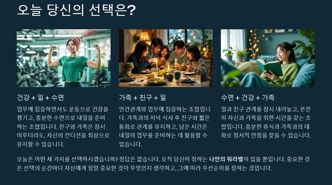 오늘은 어떤 세 가지를 선택하시겠습니까? ‘일, 수면, 건강’? 혹은 ‘가족, 친구, 일’? 정답은 없습니다. 오직 당신이 정하는 나만의 워라밸이 있을 뿐입니다.