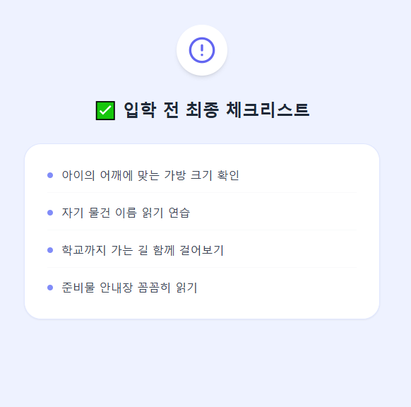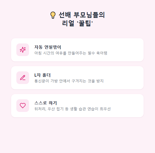 - 생활 습관 점검: 물건보다 중요한 건 '스스로 하기'입니다. 화장실 뒤처리, 우산 접고 펴기, 자기 이름 읽고 쓰기 등을 입학 전 집에서 즐겁게 연습해 보세요.