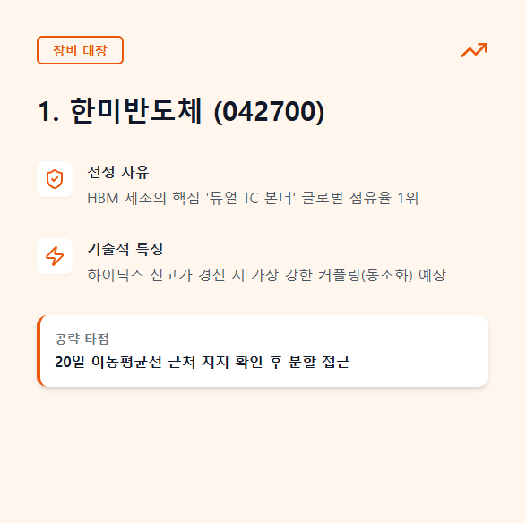 - 선정 사유: HBM 제조의 핵심 장비인 '듀얼 TC 본더' 글로벌 점유율 1위 기업입니다. SK하이닉스의 HBM 증설은 곧 한미반도체의 매출 직결을 의미할 만큼 독점적 지위를 가집니다.