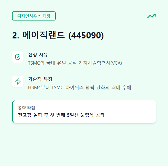 - 선정 사유: TSMC의 국내 유일 공식 VCA(가치사슬협력사)입니다. SK하이닉스가 HBM4부터 TSMC와 파운드리 협력을 강화함에 따라, 두 거인 사이를 잇는 디자인하우스로서의 역할이 독보적으로 부각됩니다.