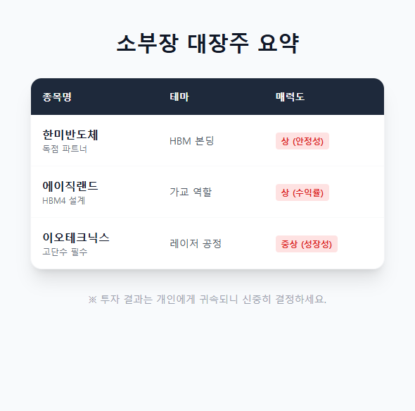 종목명 핵심 테마 SK하이닉스 연관성 투자 매력도 한미반도체 HBM 본딩 장비 독점적 파트너십 상 (안정성) 에이직랜드 TSMC-하이닉스 가교 HBM4 설계 협력 상 (수익률) 이오테크닉스 레이저 공정 고단수 HBM 필수 중상 (성장성)