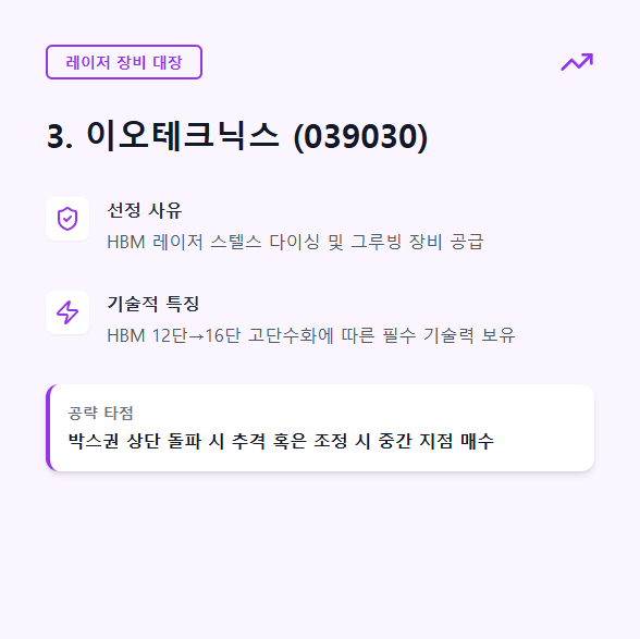 - 선정 사유: HBM 공정에서 칩을 얇게 깎고 자르는 레이저 스텔스 다이싱 및 그루빙 장비를 공급합니다. HBM 단수가 12단에서 16단으로 높아질수록 필수적인 기술력을 보유하고 있습니다.